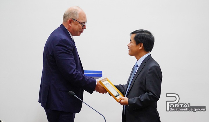 Chủ tịch UBND tỉnh Thừa Thiên Huế Nguyễn Văn Phương và ông Robert Greenan, Quyền Tổng Lãnh sự Hoa Kỳ tại Việt Nam trao quà lưu niệm tại buổi gặp mặt - Ảnh thuathienhue.gov.vn